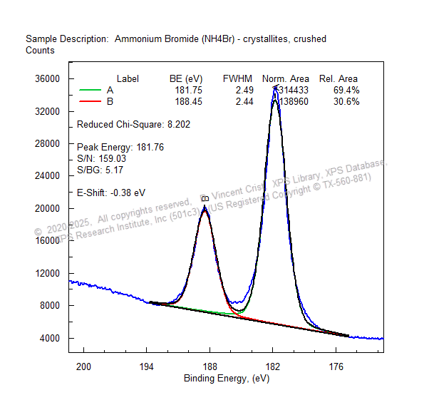 Br (3p) Spectrum from NH4Br – Peak-Fit Freshly exposed bulk, Flood gun is ON, C (1s) BE = 285.0 eV, Ag FWHM = 0.75 eV |