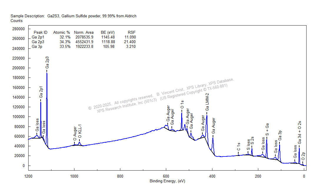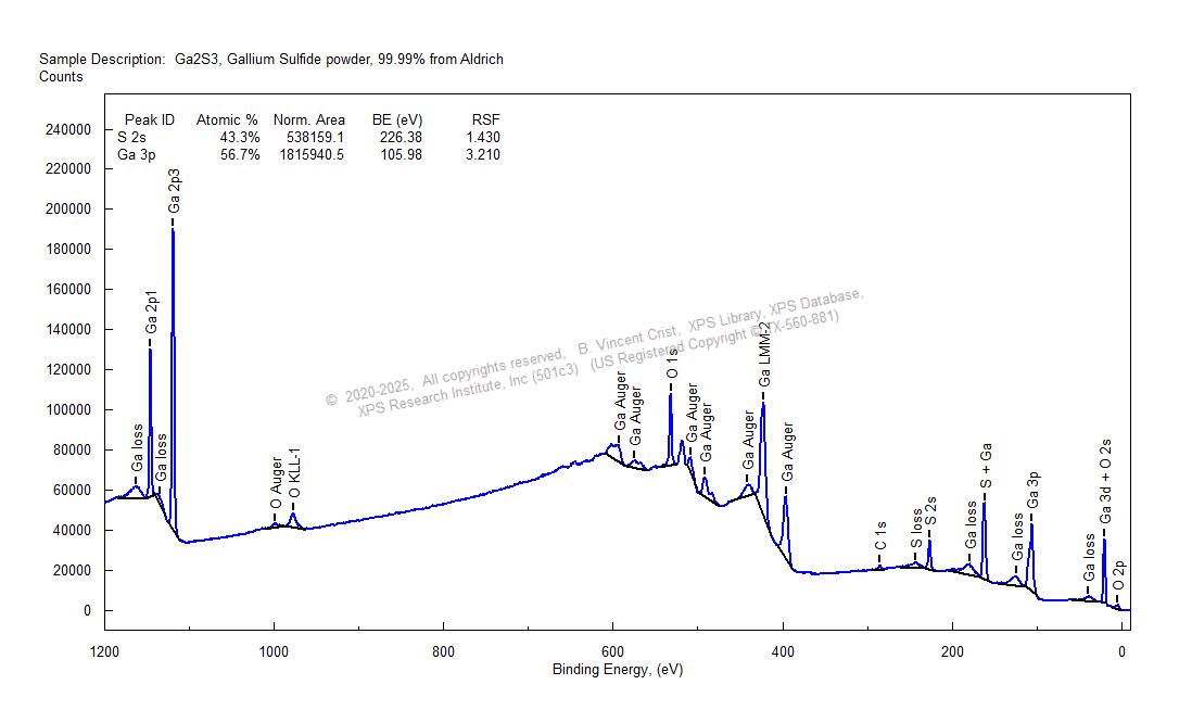 | Survey Spectrum from Ga2S3 Freshly exposed bulk, Flood gun is ON, C (1s) BE = 285.0 eV, Ag (3d5/2) FWHM = 1.3 eV |