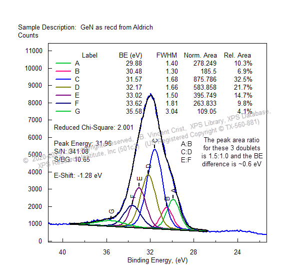 Ge (3d) Spectrum from GeN – Peak-Fit Freshly exposed bulk, Flood gun is ON, C (1s) BE = 285.0 eV, Ag FWHM = 0.75 eV |