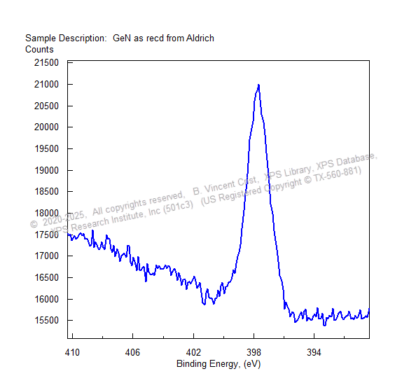 N (1s) Spectrum from GeN – Peak-fit Freshly exposed bulk, Flood gun is ON, C (1s) BE = 285.0 eV, Ag FWHM = 0.75 eV |
