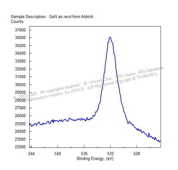 O (1s) Spectrum from GeN – Peak-Fit Freshly exposed bulk, Flood gun is ON, C (1s) BE = 285.0 eV, Ag FWHM = 0.75 eV |
