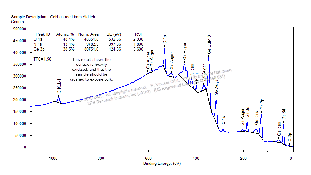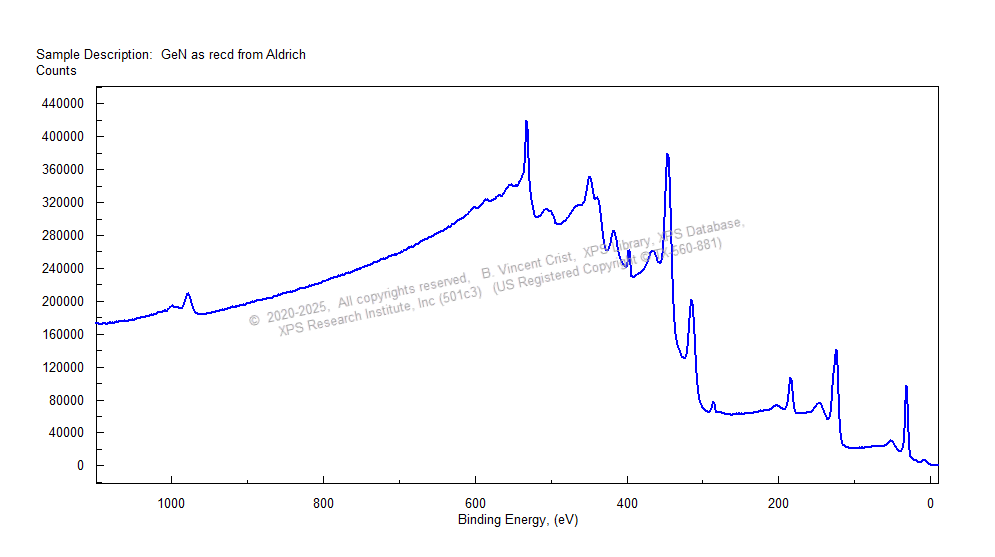 | Survey Spectrum from GeN Freshly exposed bulk, Flood gun is ON C (1s) BE = 285.0 eV, Ag (3d5/2) FWHM = 1.3 eV |