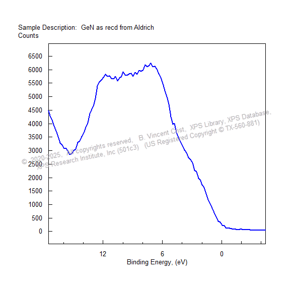 Valence Band Signals from GeN – Raw Freshly exposed bulk, Flood gun is ON, C (1s) BE = 285.0 eV, Ag FWHM = 0.75 eV |