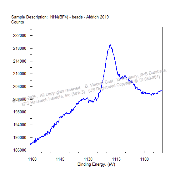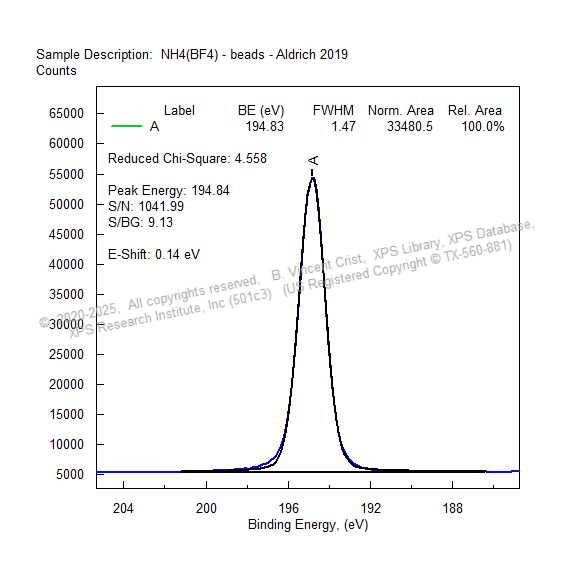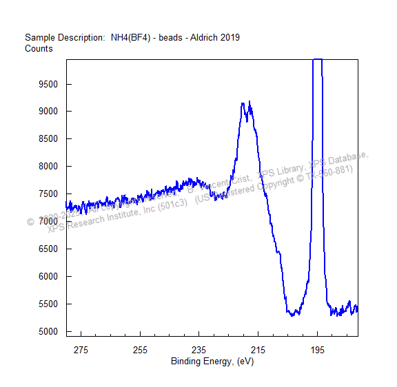 B (1s) Spectrum from NH4BF4 – Peak-Fit Freshly exposed bulk, Flood gun is ON, C (1s) BE = 285.0 eV, Ag FWHM = 0.75 eV |