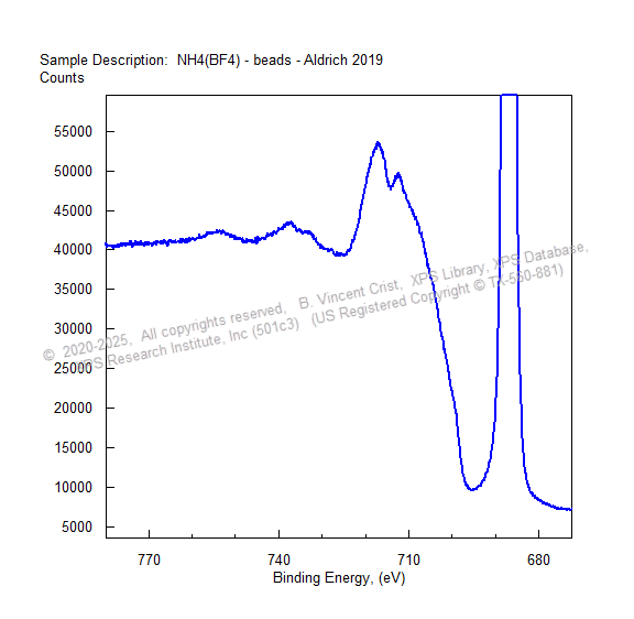 F (1s) Spectrum from NH4BF4 – expanded Freshly exposed bulk, Flood gun is ON, C (1s) BE = 285.0 eV, Ag FWHM = 0.75 eV |