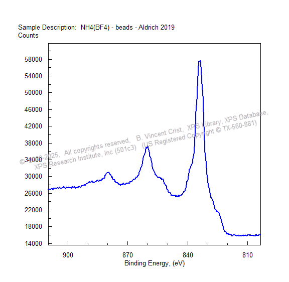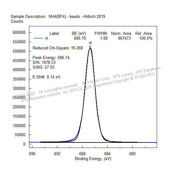 F (1s) Spectrum from NH4BF4 – Peak-fit Freshly exposed bulk, Flood gun is ON, C (1s) BE = 285.0 eV, Ag FWHM = 0.75 eV |