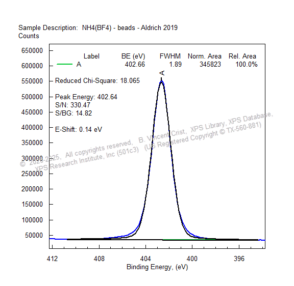 N (1s) Spectrum from NH4BF4 – Peak-Fit Freshly exposed bulk, Flood gun is ON, C (1s) BE = 285.0 eV, Ag FWHM = 0.75 eV |