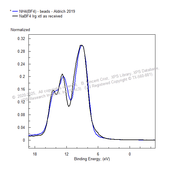 B (1s) Spectra – Overlay of NH4BF4 and NH4BF4 Freshly exposed bulk, Flood gun is ON, C (1s) BE = 285.0 eV, Ag FWHM = 0.75 eV |