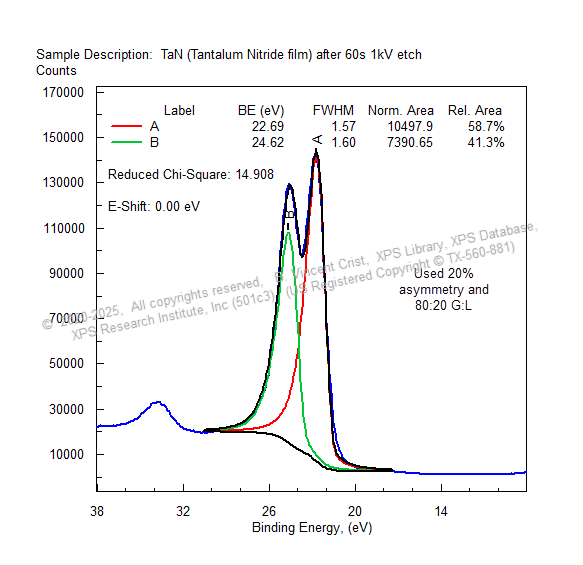Ta (4f) Spectrum from TaN – Peak-Fit Freshly exposed bulk, Flood gun is OFF (conductive), C (1s) BE = 284.99 eV, Ag FWHM = 0.75 eV |