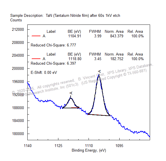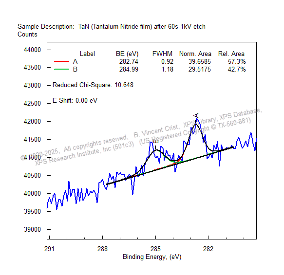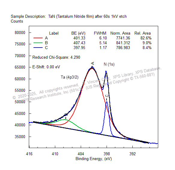 N (1s) Spectrum from TaN – Peak-Fit Freshly exposed bulk, Flood gun is OFF (conductive), C (1s) BE = 284.99 eV, Ag FWHM = 0.75 eV |